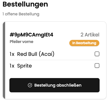 Sobald eine Bestellung in Bearbeitung ist, kann jedes einzelner Artikel abgehakt werden. Anschließend kann die Bestellung abgeschlossen werden.