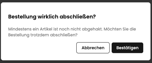 Falls nicht alle Artikel abgehakt worden sind und man auf “Bestellung abschließen” tippt, erscheint folgende Meldung, die bestätigt werden muss.